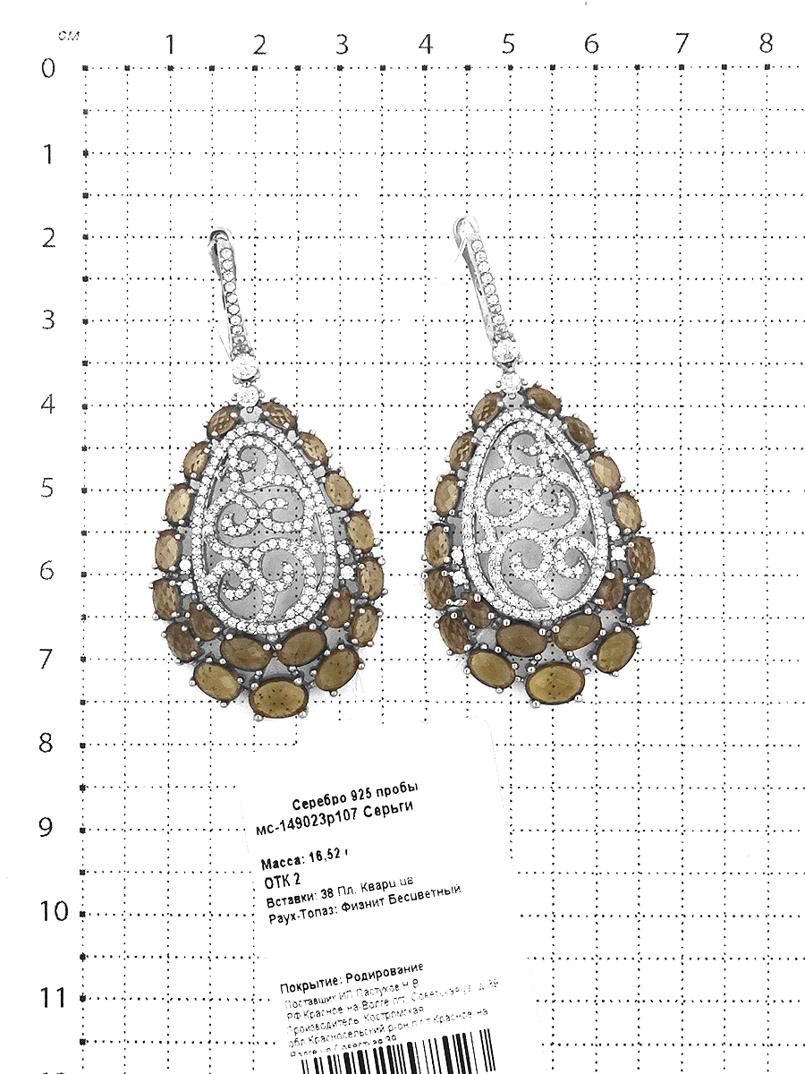 Серьги из серебра с пл.кварцем цв.раухтопаз и фианитами родированные