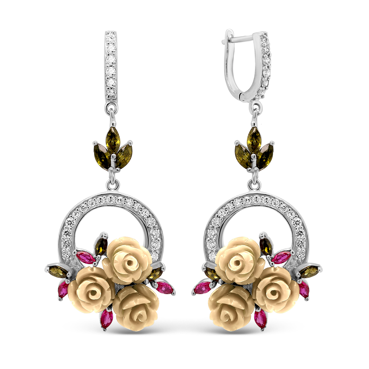 Серьги из серебра с пл.кварцем цв.турмалин, цв.рубин и фианитами родированные