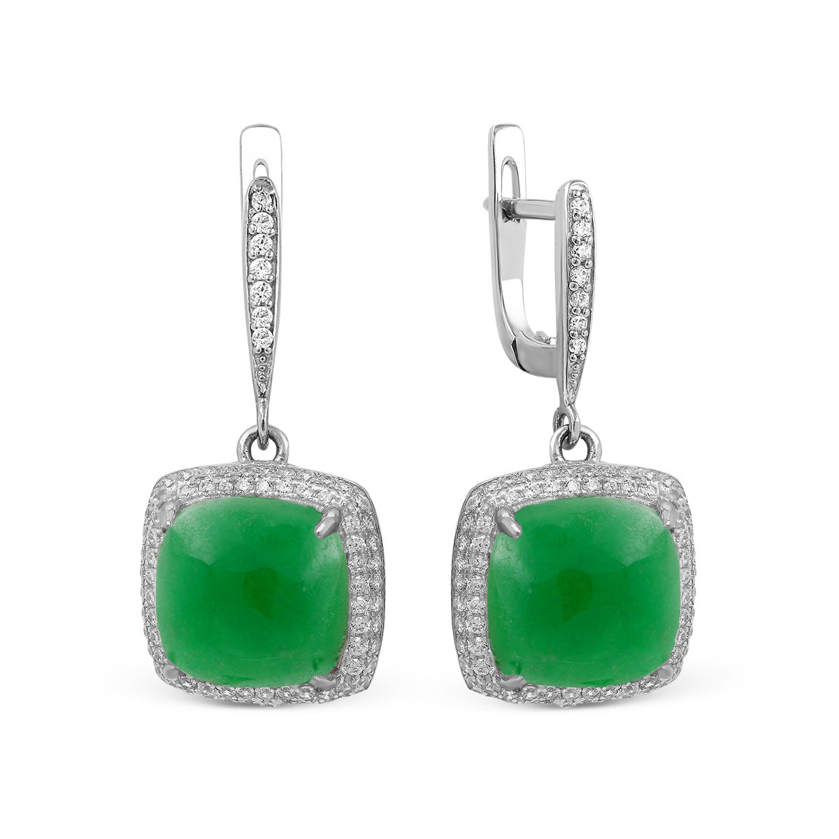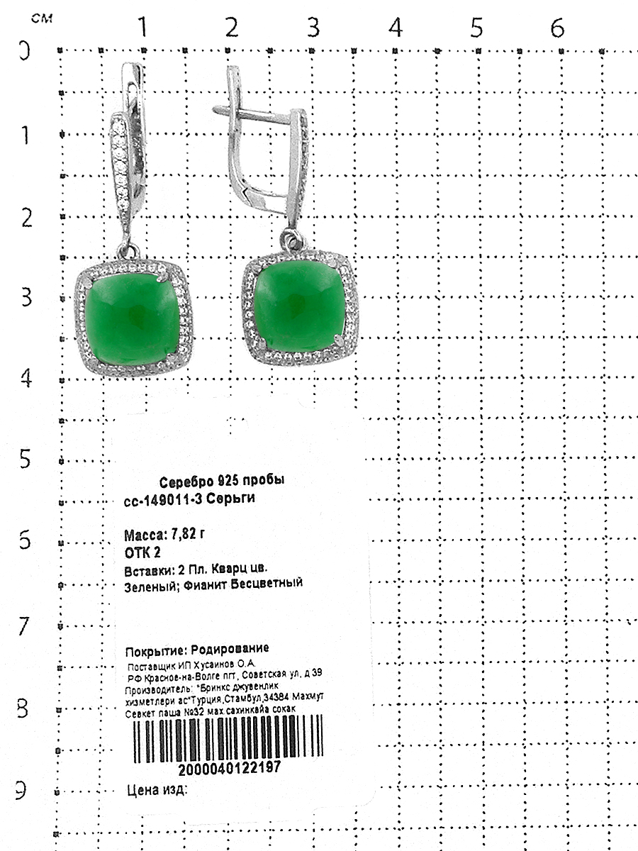 Серьги из серебра с пл.кварцем цв.зелёный и фианитами родированные