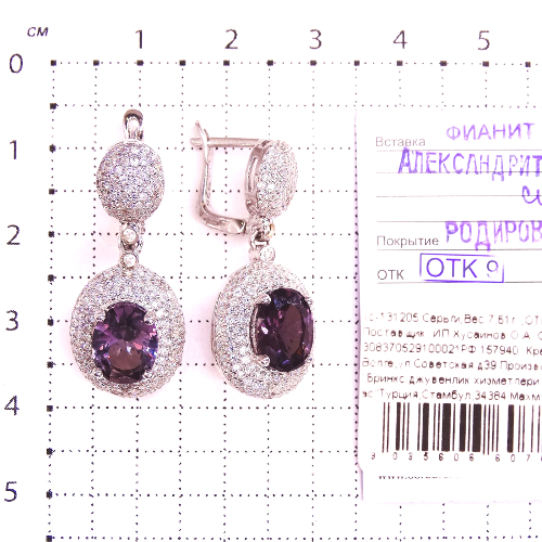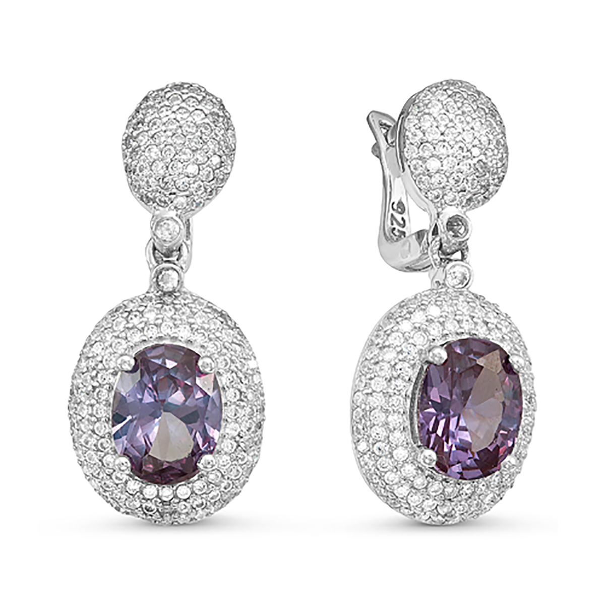 Серьги из серебра с синт. александритом и фианитами родированные кс-131205