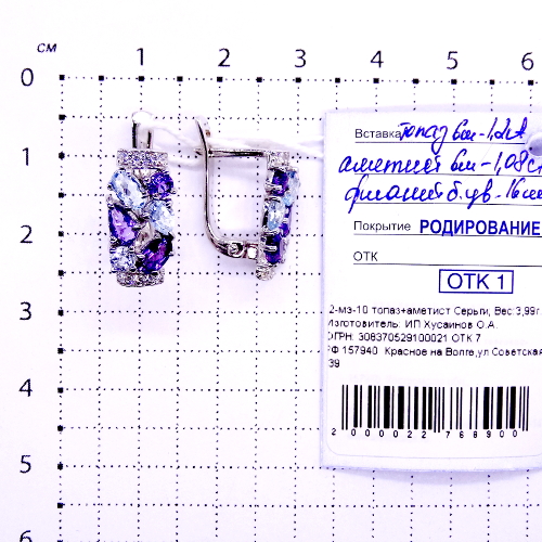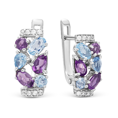Серьги из серебра с топазом, аметистом и фианитами родированные