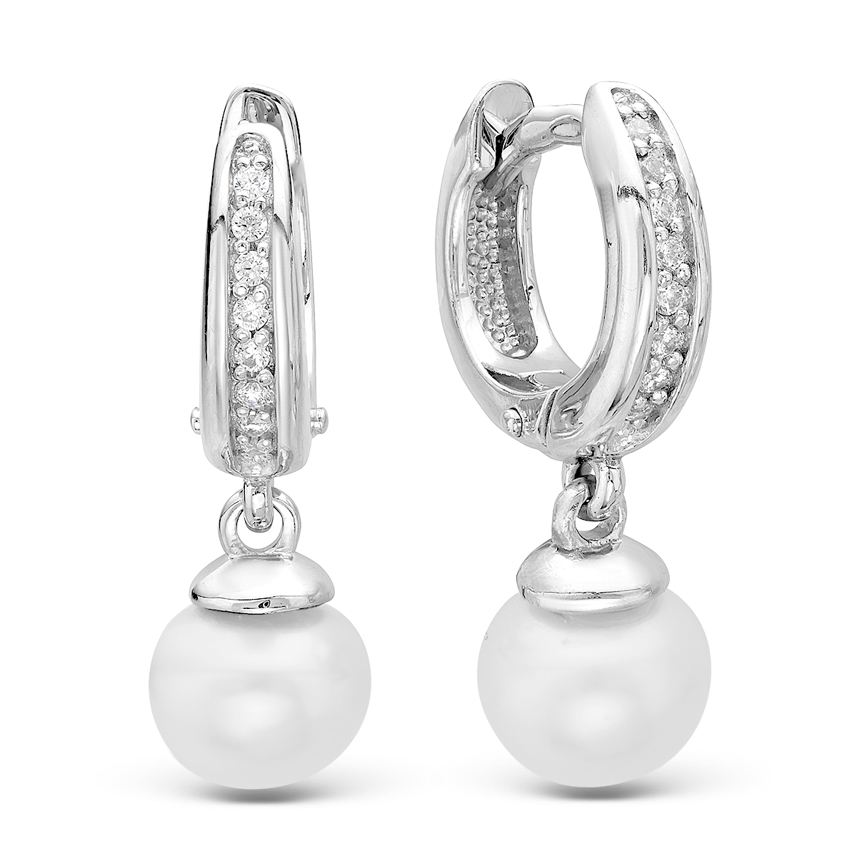 Серьги из серебра с жемчугом Сваровски и фианитами родированные
