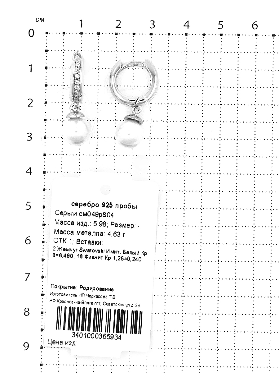 Серьги из серебра с жемчугом Сваровски и фианитами родированные См049р804
