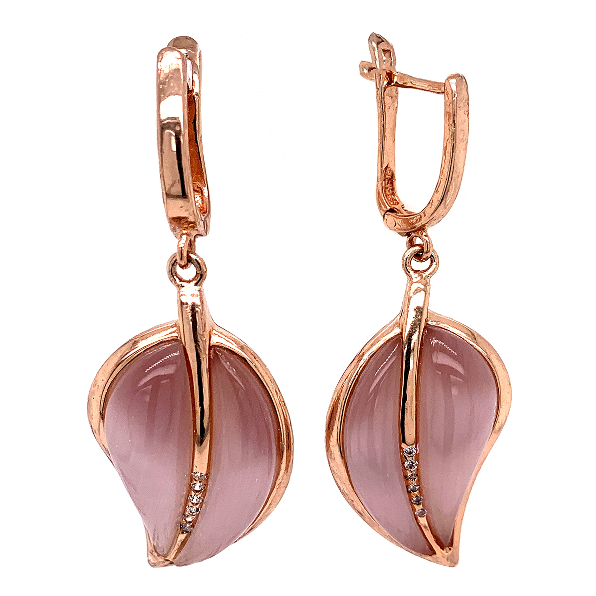 Серьги из золочёного серебра с пл. кварцем цв. кошачий глаз и фианитами