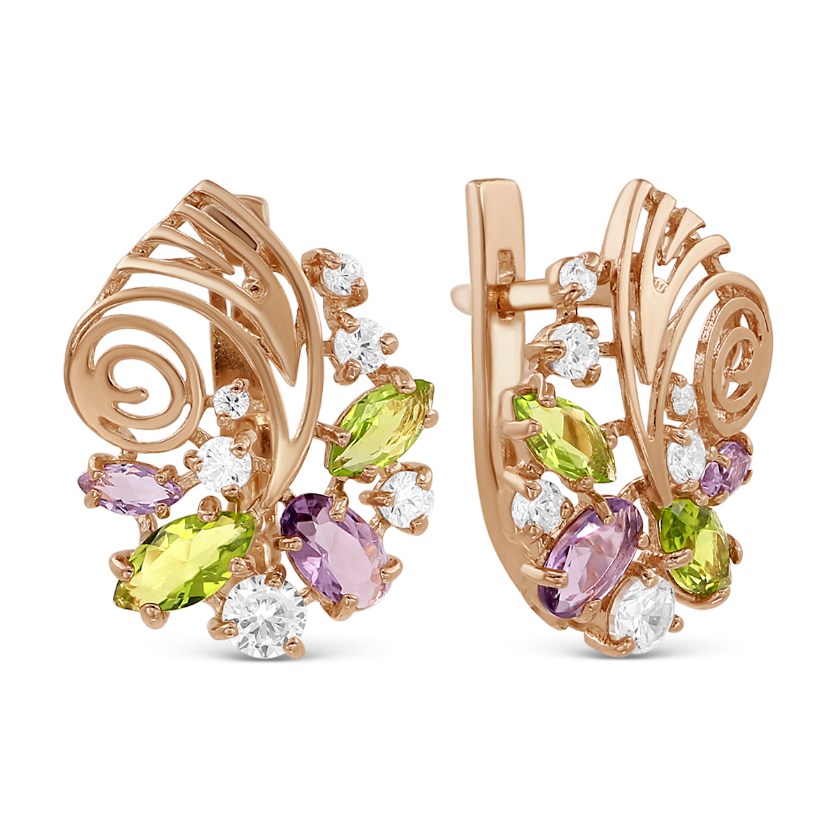 Серьги из золочёного серебра с пл.кварцем цв.хризолит,аметист и фианитами