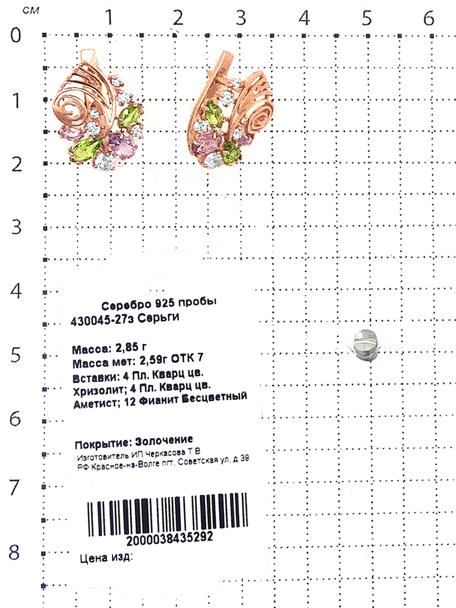 Серьги из золочёного серебра с пл.кварцем цв.хризолит,аметист и фианитами 430045-27з
