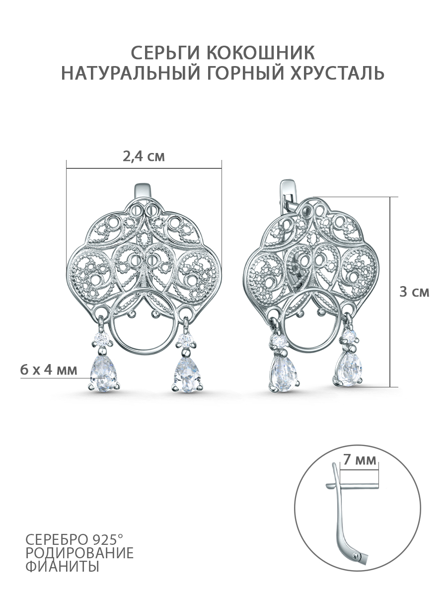 Серьги кокошники из серебра с натуральным горным хрусталём и фианитами родированные