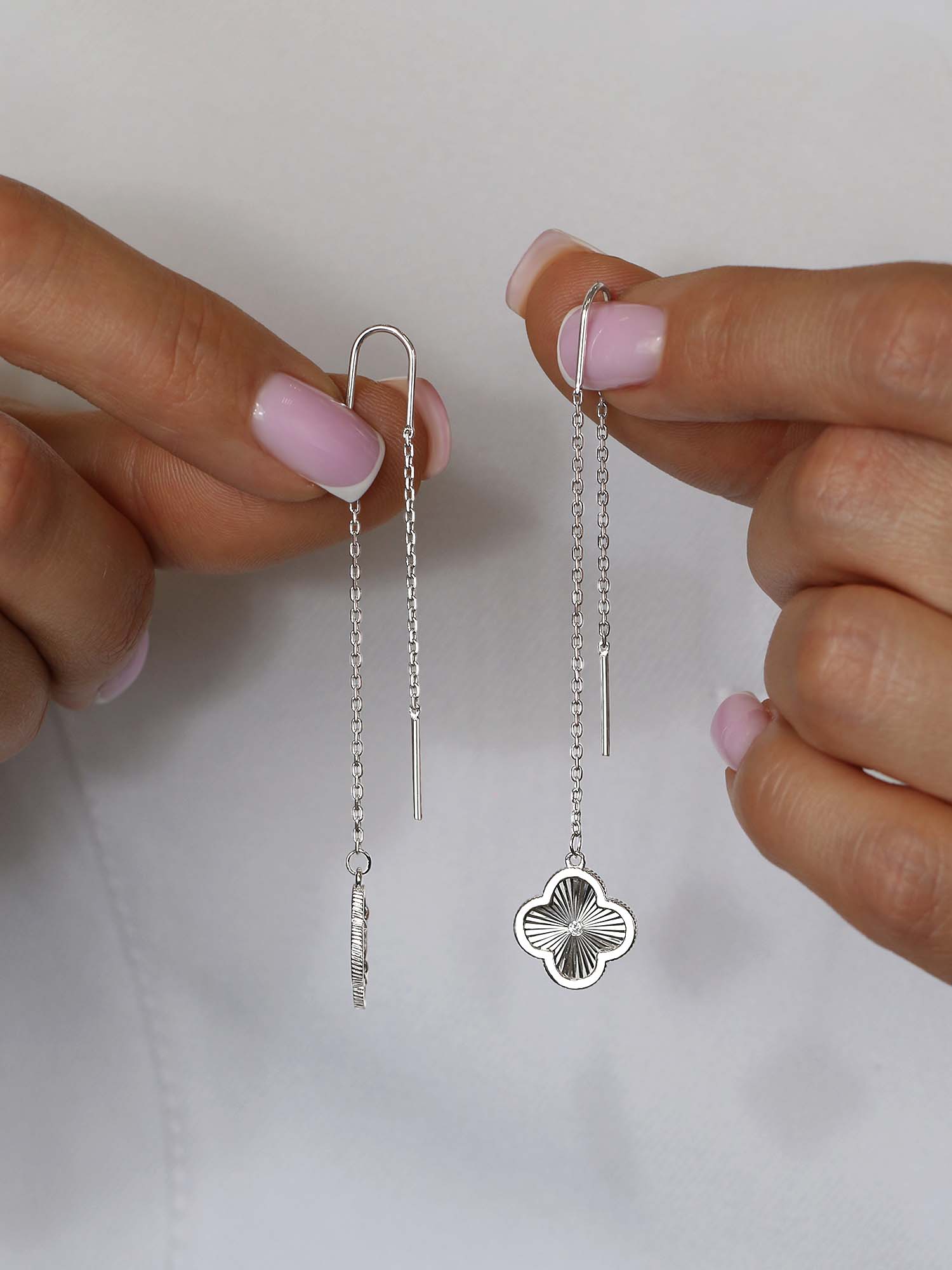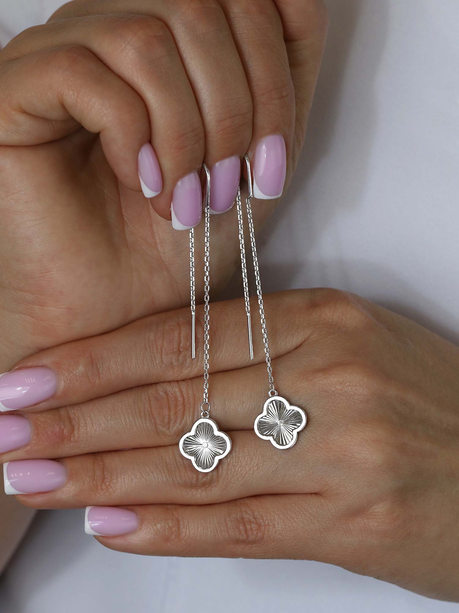 Серьги-продёвки длинные серебро в форме клевер с фианитом родированное коллекция Wan clover 925 пробы 421-15-941р