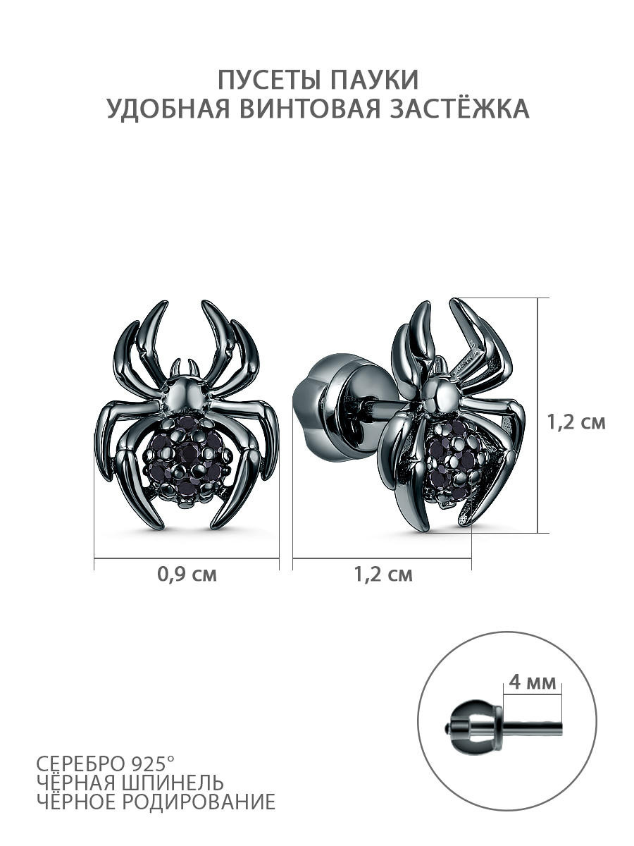 Серьги-пусеты из серебра с чёрной шпинелью и тёмным родированием - Пауки