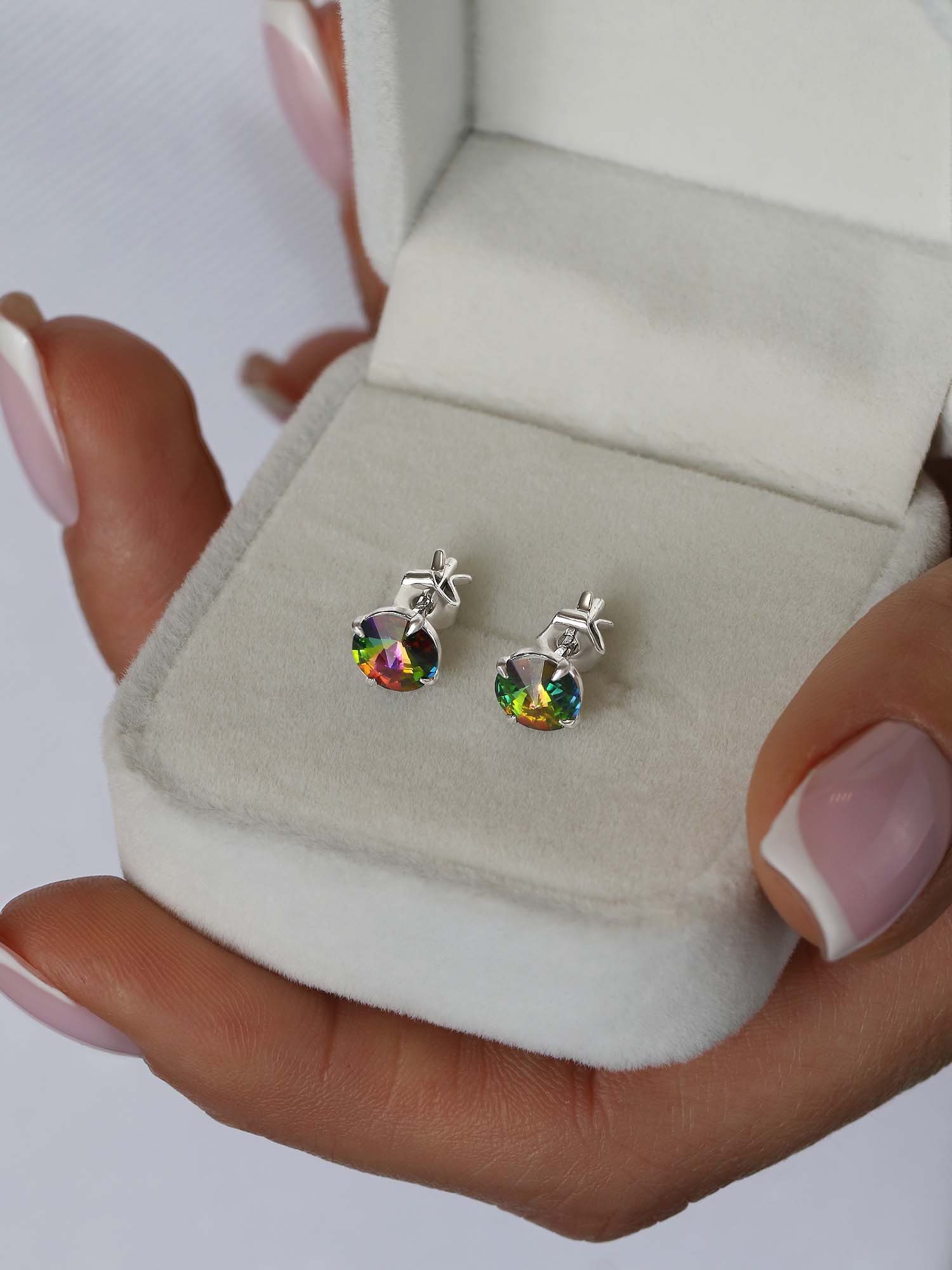 Серьги-пусеты из серебра с кристаллами премиум Австрия мистик зелёный родированные 925 пробы 0017с-001VM