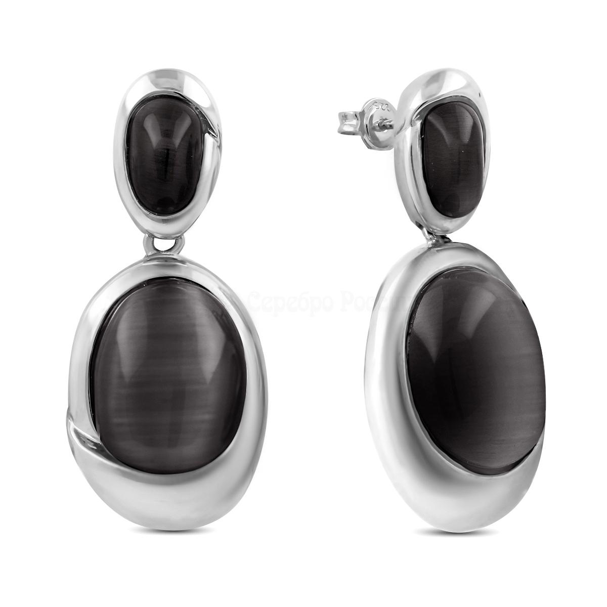 Серьги-пусеты из серебра с кварцем кошачий глаз родированные