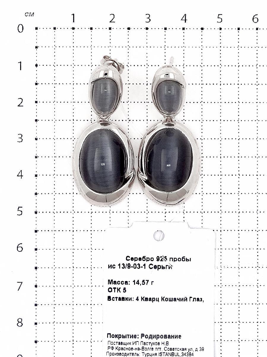 Серьги-пусеты из серебра с кварцем кошачий глаз родированные ис 13/9-03-1