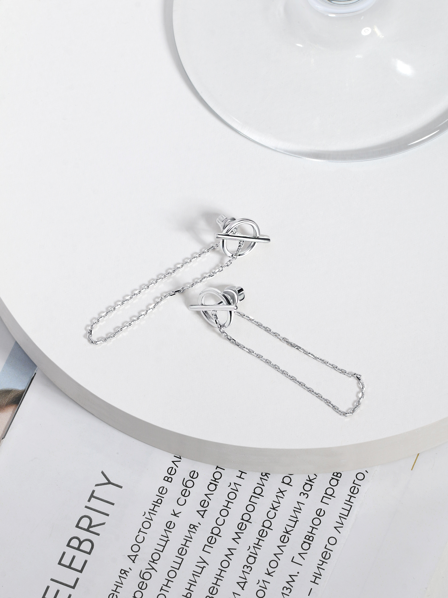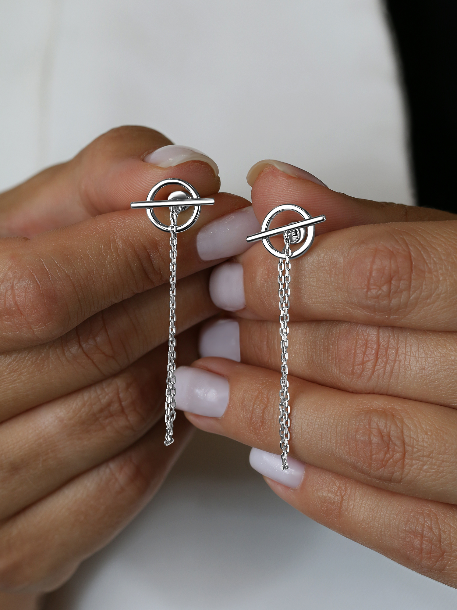 Серьги-пусеты с цепочками из серебра родированные