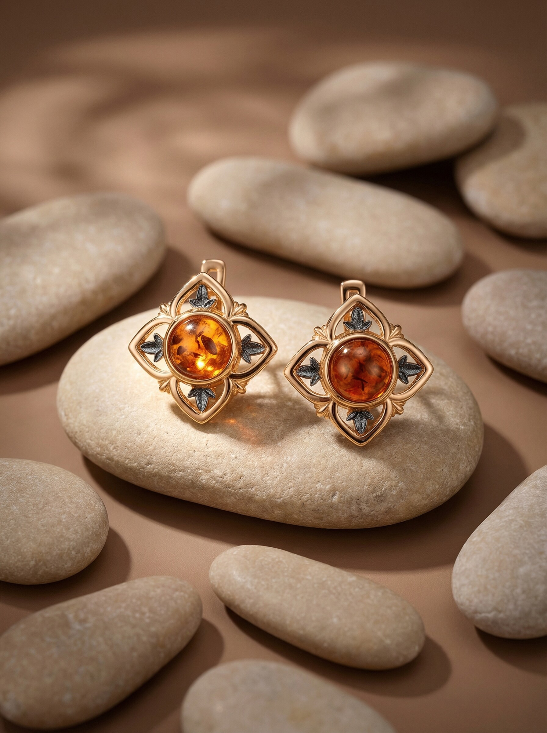Серьги женские из золочёного серебра с янтарём и родированием