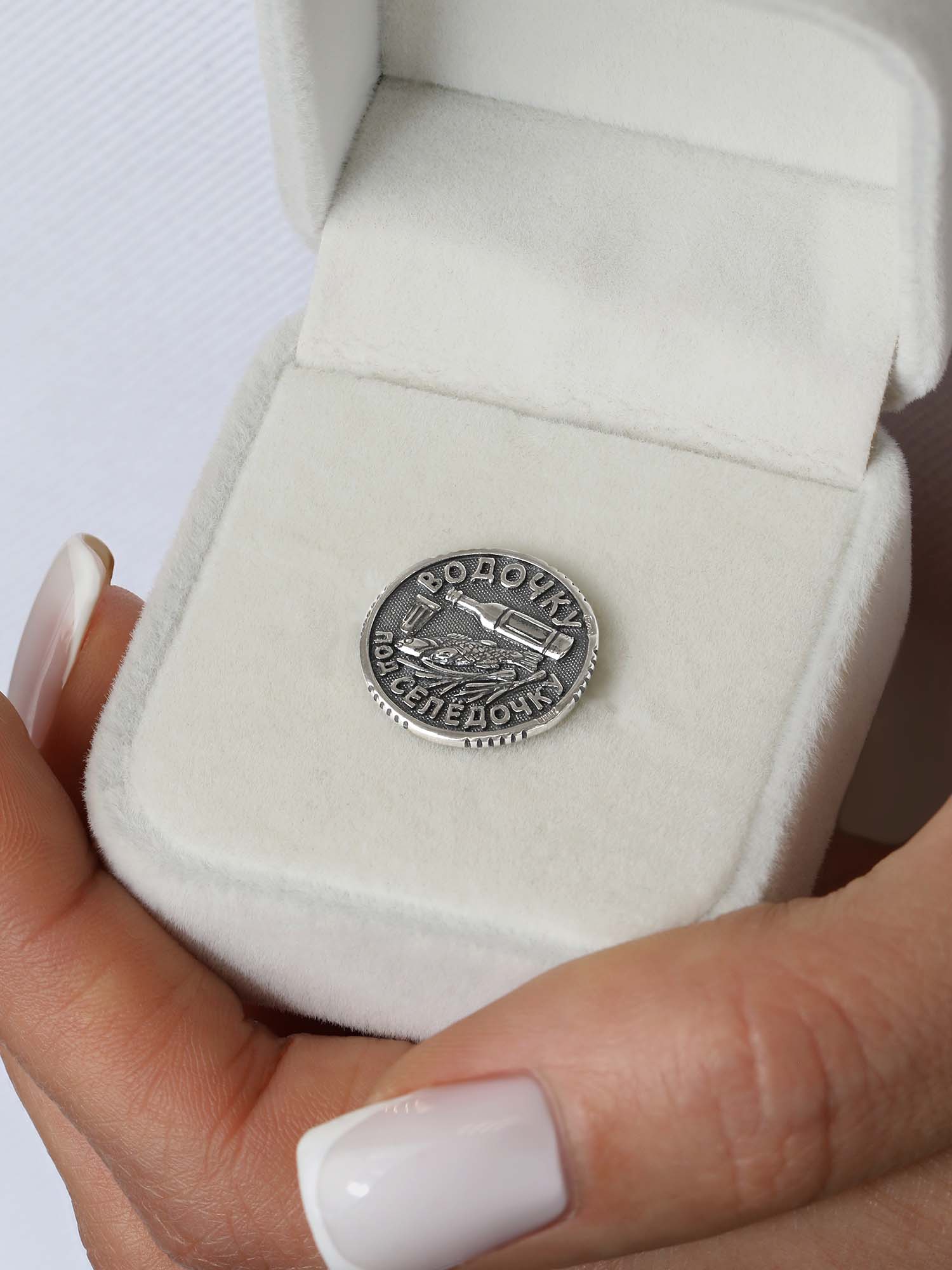 Монета сувенирная "пятничная" из чернёного серебра - Пиво под рыбку, Водочку под селёдочку